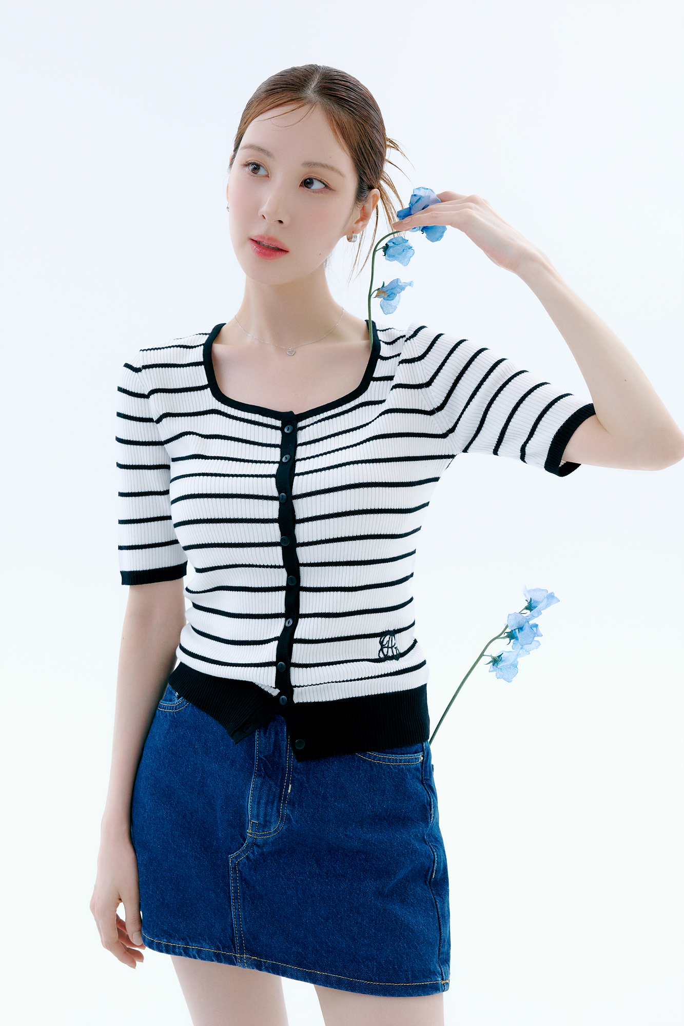 프렌치 무드의 스퀘어넥 가디건에 청치마를 착용하여 싱그러운 스타일을 제안한다