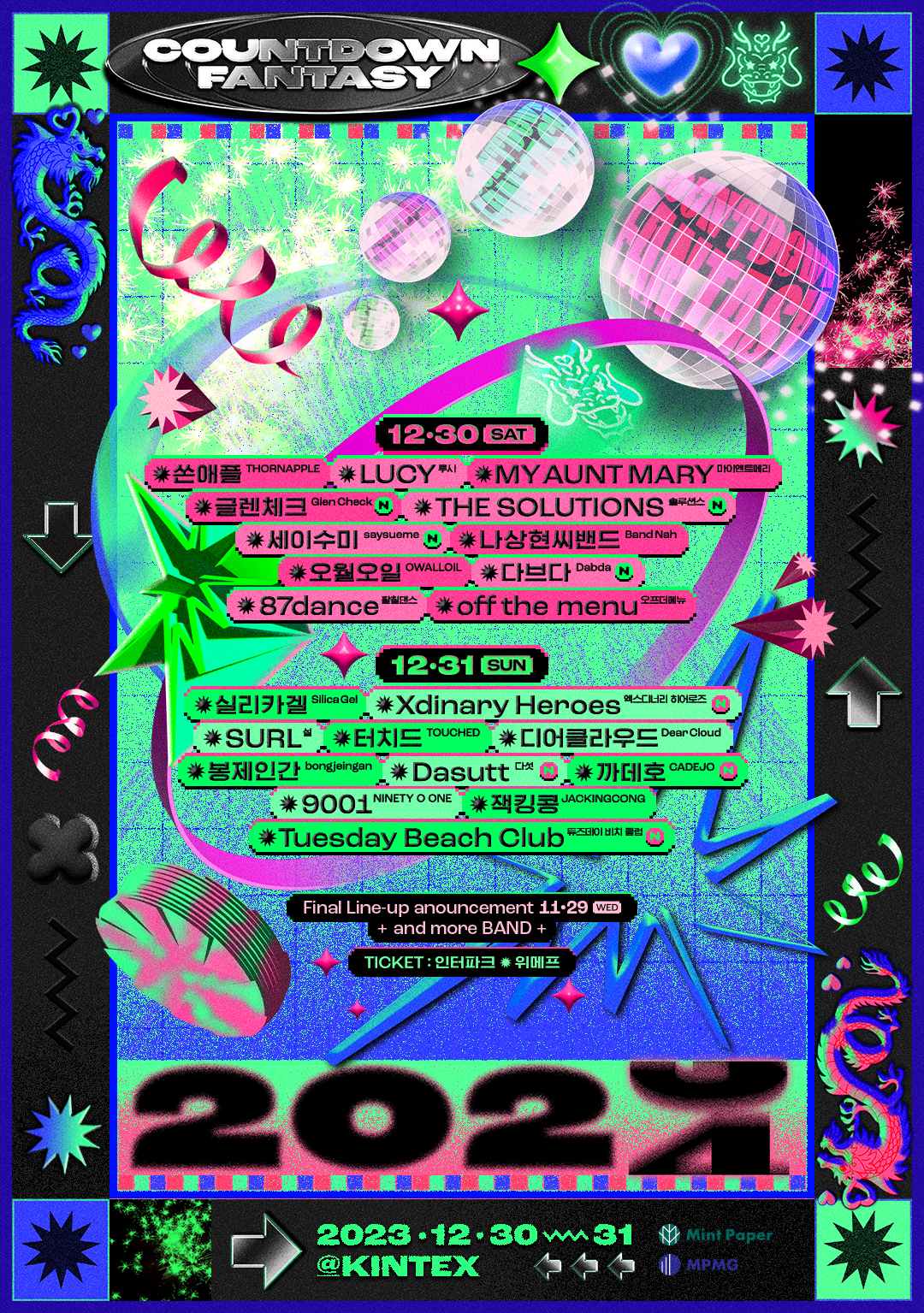 12월 30 일과 31 일 양일에 걸쳐 킨텍스에서 2개의 스테이지로 진행 예정인, 올해의 마지막 페스티벌 ‘카운트다운 판타지 2023-2024(COUNTDOWN FANTASY 2023-2024, 이하 CDF)’가 ‘MY AUNT MARY(마이앤트메리)’, ‘LUCY(루시)’, ‘쏜애플’, ‘봉제인간’, ‘SURL(설)’, ‘실리카겔’, ‘나상현씨밴드’, ‘터치드’ 등 14팀으로 구성된 1차 라인업 공개에 이어 11월 15일 2차 라인업을 공개했다. 1차 라인업과 마찬가지로 이번 라인업 또한 모두 밴드로 구성되어 있어 다양한 … Read more