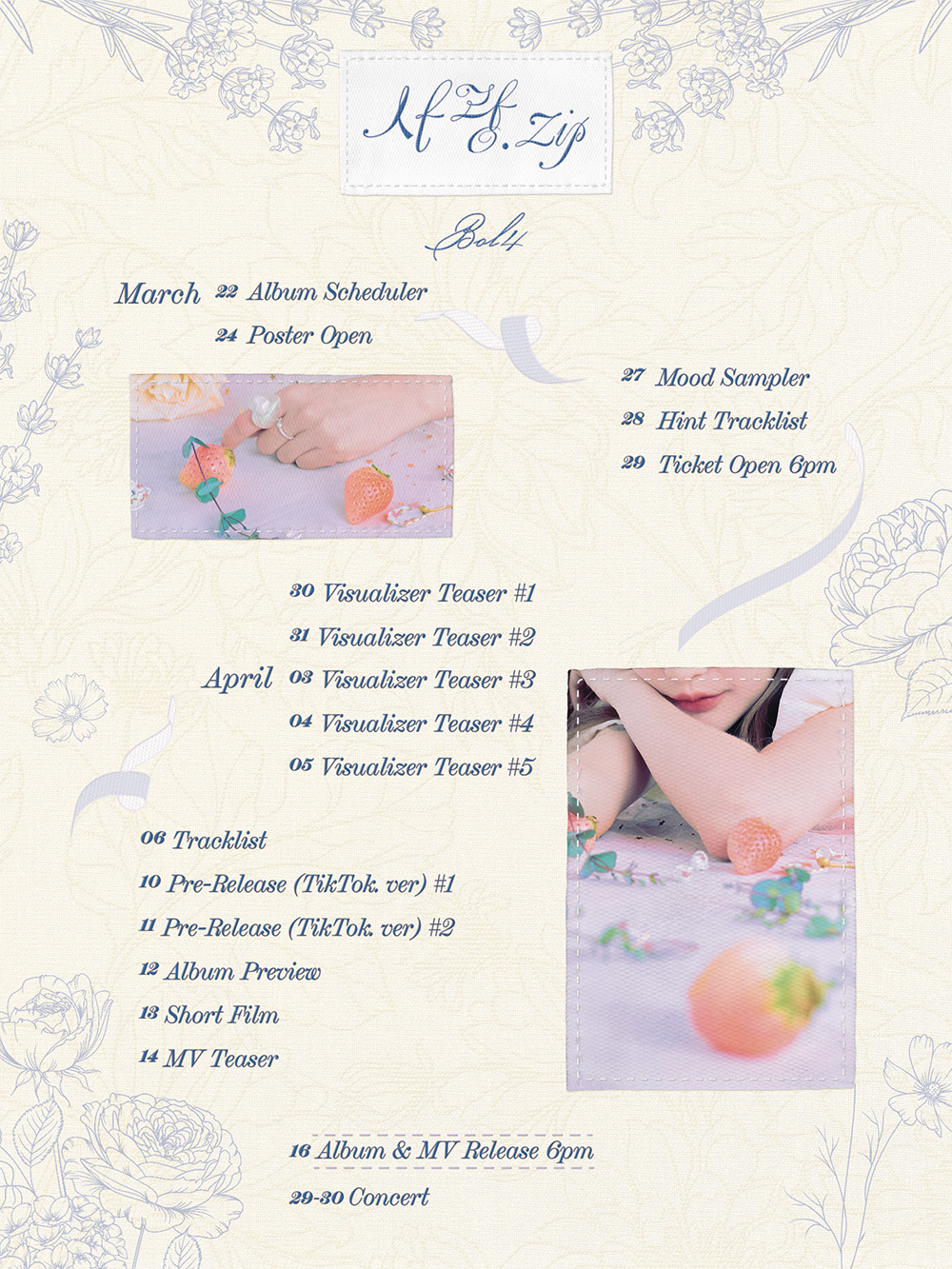 볼빨간사춘기가 신보 ‘사랑.zip’의 앨범 스케줄러를 공개했다. 소속사 쇼파르엔터테인먼트는 22일 오후 공식 SNS를 통해 볼빨간사춘기 미니앨범 ‘사랑.zip’의 앨범 스케줄러를 공개하며 본격적인 컴백 카운트다운에 돌입했다. 스케줄러에는 앞서 공개된 커밍순 이미지와 같이 딸기를 소품으로 활용한 안지영 의 모습이 클로즈업되어 담겨있다. 또한 꽃과 리본, 자수를 활용한 디자인이 볼빨간사춘기만의 로맨틱하고 사랑스러운 무드를 완성했다. 1년 만에 발매되는 미니 앨범인 만큼 다채롭게 준비된 티징 콘텐츠가 시선을 사로잡는다. 콘서트 포스터 공개를 시작으로 무드 샘플러, 힌트 트랙리스트, 5종의 비주얼라이저 티저, 트랙리스트, 앨범 프리뷰와 뮤직비디오 티저를 순차적으로 오픈한다. 최종적으로 4월 16일 앨범과 음원, 뮤직비디오가 공개되며, 이어 4월 29~30일 예정 된 단독 콘서트 까지 팬들의 기대감을 배가시킨다. 최근 ‘Love Story’가 틱톡 챌린지를 통해 높은 인기를 끌며 음원 역주행 의 쾌거를 이룬 볼빨간사춘기는, 이번 신곡 음원을 정식 음원 발매 전 ‘Pre-Release (TikTok.ver)’ ( 틱톡 음원 선공개 ) 하며 대중들에게 한발 빠르게 선보일 예정이다. 한편 볼빨간사춘기의 새 앨범 ‘사랑.zip’은 오는 4월 16일 오후 6시 각종 음원사이트에서 공개되며, 이어 4월 29일부터 30일까지 올림픽홀에서 단독콘서트를 개최한다. 같은 달 15일에는 대만에서 단독 콘서트를 연다.